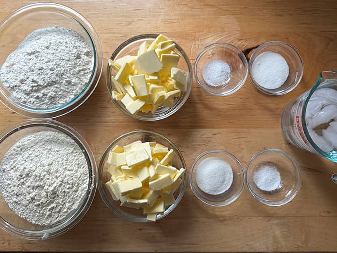 Friends, hello. On Tuesday, just before heading out the door for school, my 15-year-old turned to me and said: "So, um, Mom, you know how I'm in French club?" Yes, I said. "Well, for the next meeting, I signed up to bring Gruyere and, um... a quiche. But I can totally buy the quiche! Does the Co-op sell quiche?" When is the meeting? I asked. "Tomorrow." I'll make the quiche, I said. I'd be happy to. "Are you sure?! I mean, I know everyone would love your homemade quiche. Thanks! Love you. Bye! I'm not sure anyone in French club cares if the quiche is homemade or not, but I can't not make the quiche from scratch when these situations arise. And besides, she did give me a whole day's heads up. What else do I have to do? So later that night, I pulled out the food processor to make the pie dough, and on Wednesday morning, I woke up early to parbake the crust and make the quiche. It felt like Thanksgiving morning, the house quiet, the rolling pin out, the countertops cluttered, the oven buzzing. And while I wouldn't have minded an extra hour of sleep, I also so relished that alone time, sipping my coffee while rolling out dough and whisking eggs with crème fraîche and thyme. The following day, inspired by the previous days' efforts, I broke out the food processor again and measured out the ingredients for two batches of pie dough: And then I made each batch, one after another, not cleaning the food processor in between. Into the freezer went the four rounds of dough: Friends, it is not too early to get a jump start on your Thanksgiving preparations, and making pie dough is the perfect first item to check off your to-do list. Go on, grab your butter. I'll wait for you. We're doing it together. Right now. I have step-by-step and video guidance in this post: