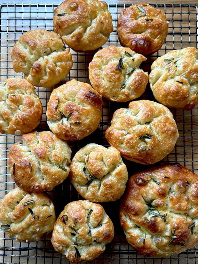 Friends, hello! Today I have three things to share with you: muffin tin focaccia, a holiday party trick, and the three cakes I rely on during the holiday season. First: focaccia. Recently I've been asked multiple times if the focaccia could be made into mini loaves by using a muffin tin. I had my doubts, worrying the focaccia would be too squished in those little wells, so decided to give it a go to confirm. I made the dough Thursday and stuck it in the fridge. Yesterday afternoon, I removed it, deflated it, and portioned it using two forks, plopping the little pieces of dough into a buttered and oiled muffin tin as I did. After 45 minutes, when the dough had puffed considerably, I dimpled the mini focaccia, sprinkled with sea salt, rosemary, and more olive oil, then baked them. Friends! They were so good. And disappeared very quickly from the kitchen yesterday afternoon as kids passed in and out. I would 100% make them again, especially on a chilly, soup-demanding evening. In the lower righthand corner of the top photo, you can see a mini loaf I made using the excess dough, which I baked in a crème brulée dish — that was a fun shape, too! There is not much to know more than what I've shared above, but I've added notes below the recipe if you'd like a little more guidance.
