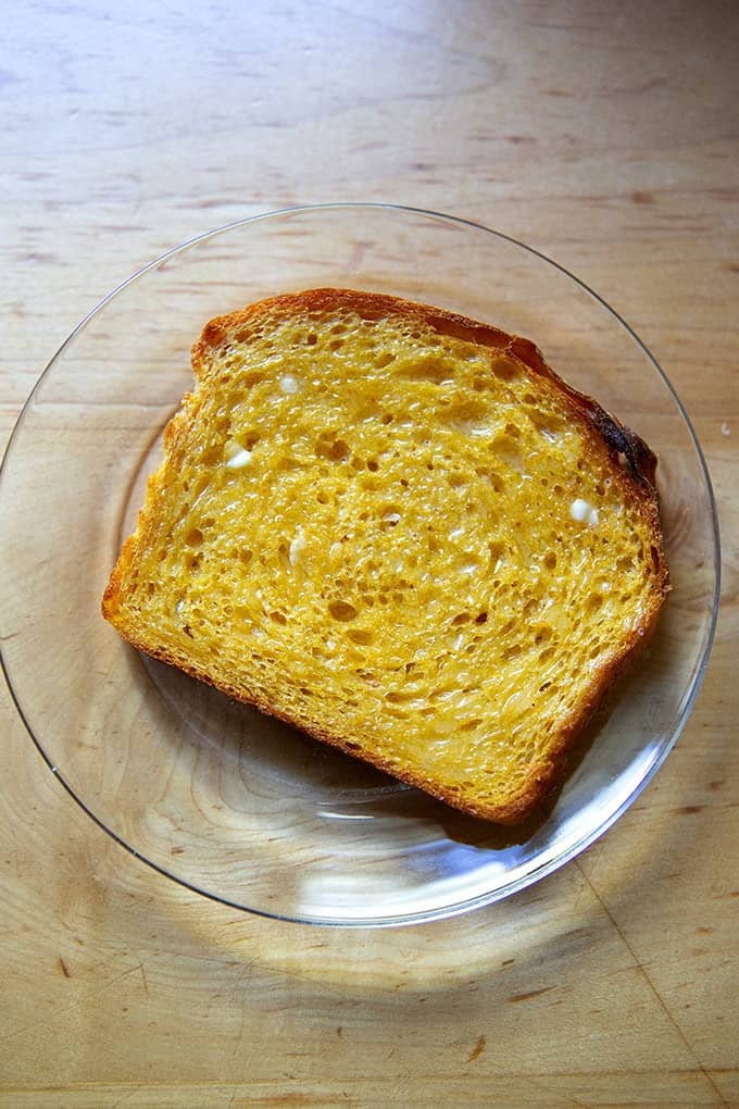 Pumpkin Toasting LoafAs noted also last week, the pumpkin muffin recipe will leave you with leftover pumpkin purée. I ended up upping the amount of pumpkin puree in the muffins to be an even 1 cup, so you're now left with a little bit less than half a can of purée. A great way to use up the purée is to stir it into bread dough. The pumpkin tinges the baked loaf a beautiful orange hue and lends a softness to the crumb. What it does not do is impart that much flavor — if you closed your eyes while taking a bite, you would never know you were eating a slice of pumpkin bread. In the weeks ahead, I’m hoping to make a more pumpkin-y tasting loaf by upping the amount of pumpkin and reducing the water. All of this said, this is a great recipe to put that leftover pumpkin puree to use! You can use the bread for sandwiches — it is soft but sturdy — and I think it would be so fun to have on hand at Thanksgiving for leftover turkey sandwiches. Also: it makes excellent toast: I've shared this recipe in Google docs, not on the blog, because it is a work in progress. Would love to hear your thoughts if you make it.
